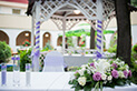 A szálloda külső kertjéből belépve a nyitott, boltíves folyosón át- ami az éttermet és a hotelt köti össze- egy ősfás mediterrán belső kertbe érünk. A középen híddal átívelt kistavon egy hófehér filagória várja az Ifjú Párt, hogy alatta kimondják a boldogító Igen-t.