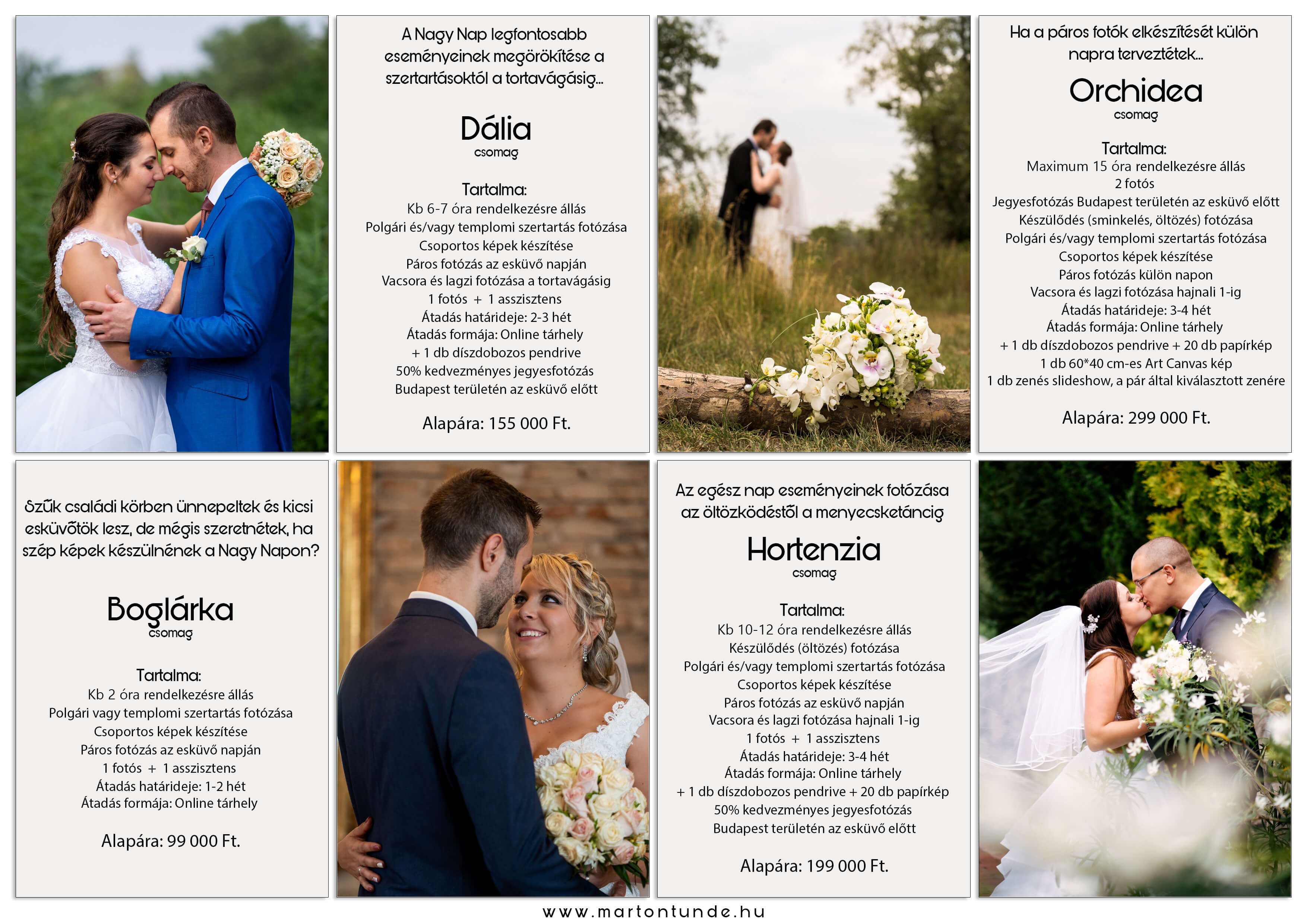 A leggyakrabban felmerülő igények alapján összeállítottam 4 csomagajánlatot. A végső árat befolyásolhatja több tényező, amiket ajánlatkérés esetén tudok pontosítani (pl távolság, plusz szolgáltatások mint pl plusz fotós, plusz pendrive, további papírképek, stb...) Amennyiben az összeállított csomagajánlatok közt nincs olyan, amilyet Ti kerestek, bátran kérjetek egyedi ajánlatot.