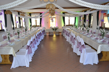 - Teremdíszítés, terítés: A terem feldíszítését elképzelésetek megismerése után elvégezzük erre kialakított egyedi áron. Amennyiben gyakori megoldásként hozott anyagból Ti szeretnétek feldíszíteni a helyszínt, erre természetesen van lehetőség. Az általános asztal elrendezés (pados megoldás, hat személy egy asztalnál) mellett térítés ellenében tudunk biztosítani kerek asztalokat is székekkel, székhuzatokkal, masnikkal.