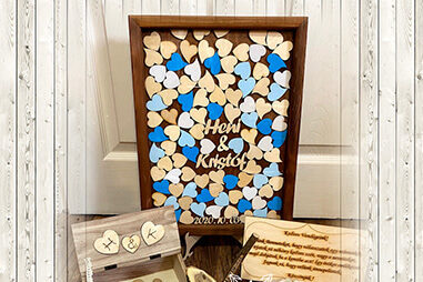 - A vendégek az esküvőtökön a szívekre írnak néhány kedves szót, vagy a neveiket, majd felülről becsúsztatják azokat a keretbe.